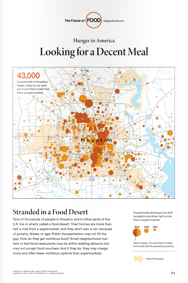 These problems in Houston have received some attention in local news media (see here, here, here, and here) and have improved some, but we really need to pause and consider the consequences of having food deserts in so, so many places across the United States. This hurts every one. It’s almost like most of the United States is a “third world nation” with people starving and stuck. In Freeport, Texas, there is one grocery store. I don’t know how many, but the number without transportation and located more than a half-mile from this store is high. This one grocery store is independently owned and thus, has to charge higher prices to survive. This further perpetuates the consequences of food deserts. Big businesses–the Walmarts, HEBs–locate stores where they can make lots and lots of money at the expense of starving people and does so by starving people. Everything revolving around money is so very problematic.