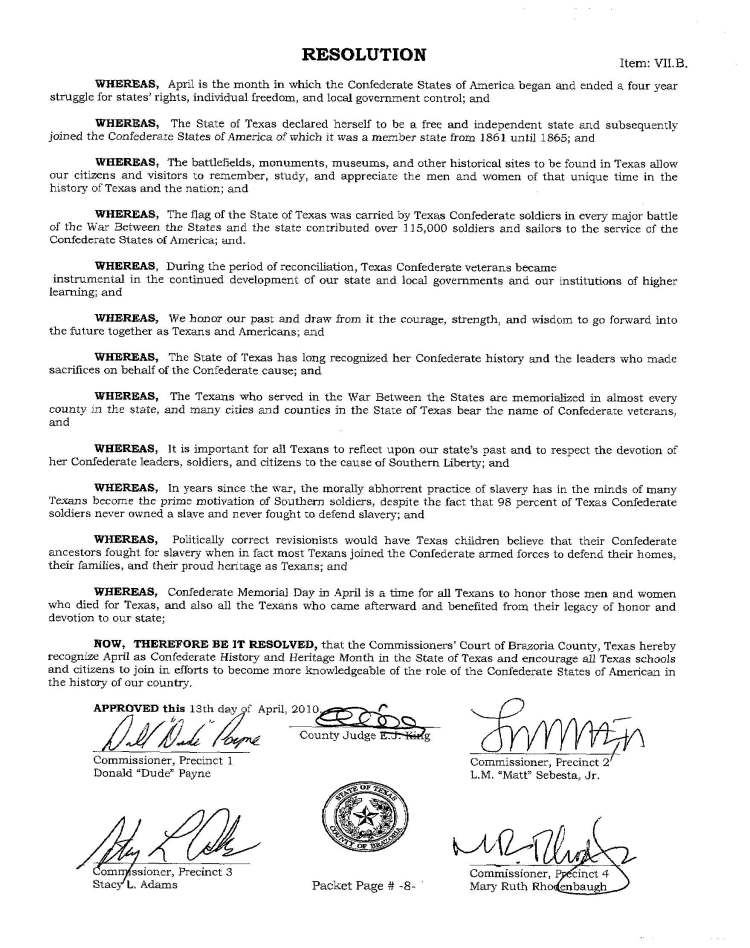 In April 2010, as you may know, the Brazoria county judge and four county commissioners signed a “Resolution” addressing issues pertinent to the Civil War. This “Resolution” is actually identical to one issued by the state of Texas in 1999. I brought copies of this for everyone. Please take a second to look at it.